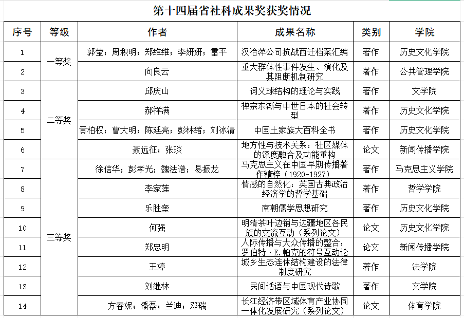 近日,第十四届湖北省社会科学优秀成果奖获奖结果揭晓,我校共有14项成果获奖,其中一等奖2项,二等奖4项,三等奖8项,获奖总数比上届增加5项,位列全省第6。